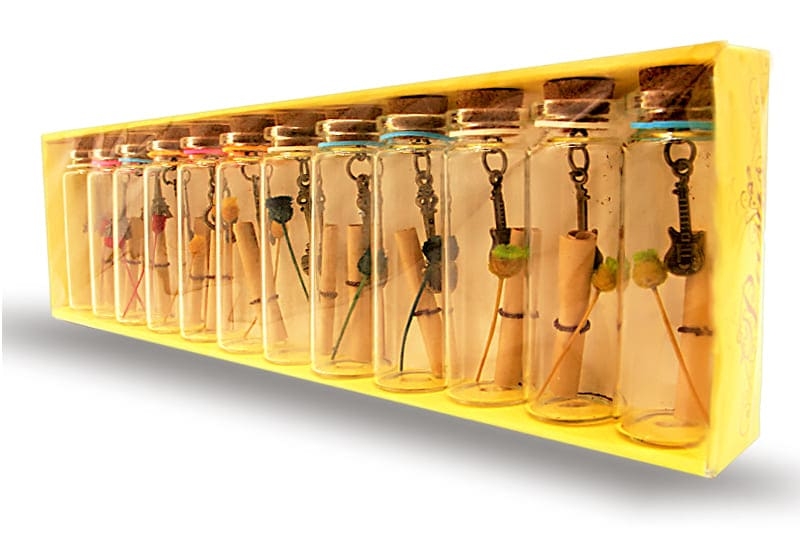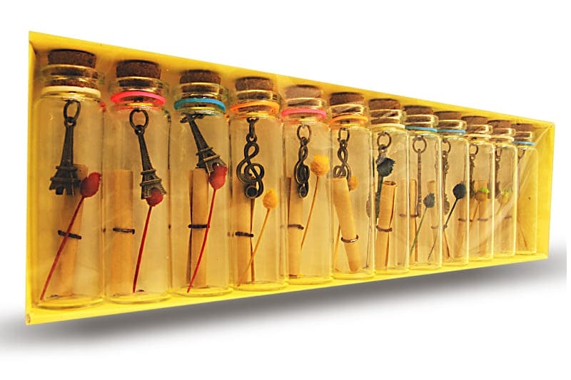 • Dekoratif cam şişe içerisinde minyatür mesaj rulosu ve bronz renkli metal aksesuar içerir