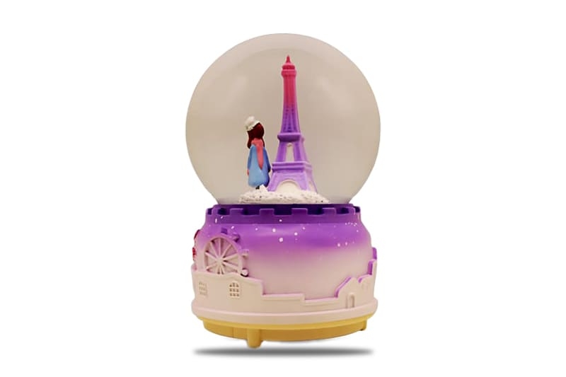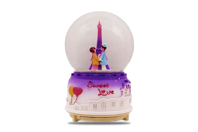 • Eiffel Kulesi figürü ve el ele tutuşan çift tasarımıyla romantik bir dekoratif kar küresi