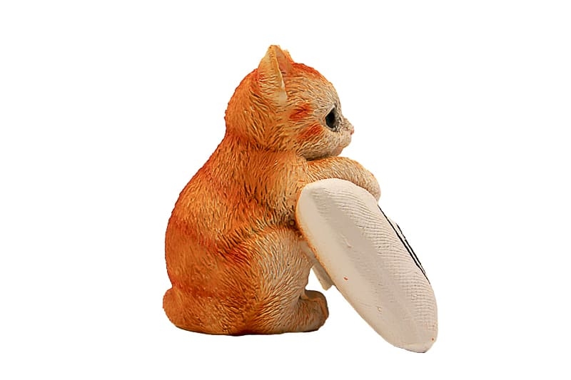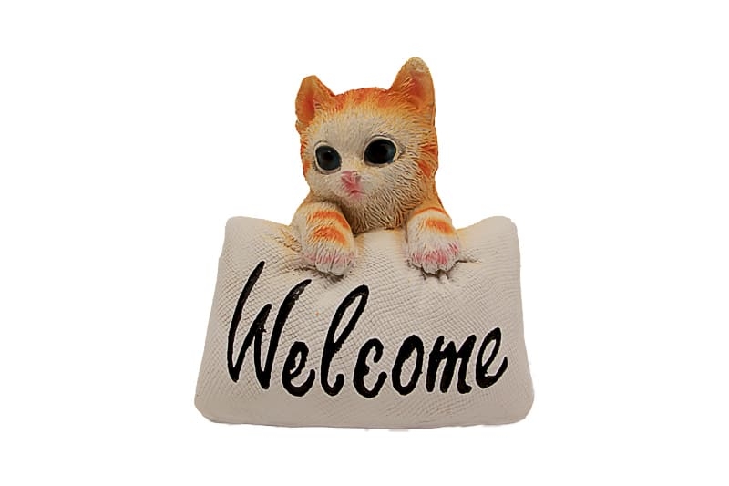 • Sevimli turuncu-beyaz kedi figürü, “Welcome” yazılı yastığın arkasından bakarak sıcak bir karşılama teması oluşturur.