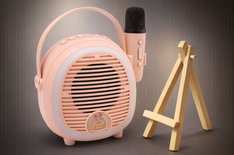 Çocuklara özel olarak tasarlanan bu retro görünümlü karaoke hoparlörü; eğlence, müzik ve yaratıcılığı bir araya getirir. Kompakt ve hafif yapısı sayesinde çocukların rahatça taşıyabileceği şekilde tasarlanmıştır. Renkli LED ışıklandırması, çoklu ses efektleri ve tripod uyumu ile evde sahne deneyimi sunar.
