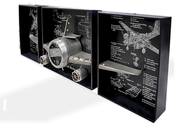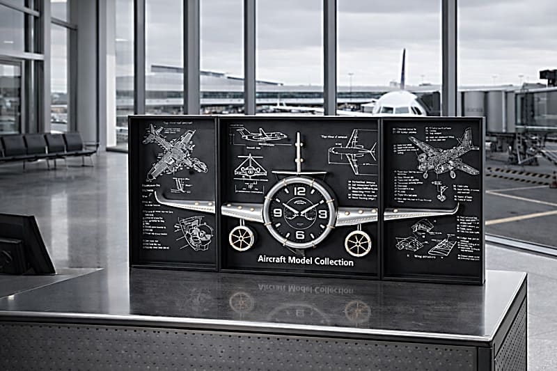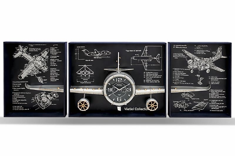 Aircraft Model Collection, havacılık tutkusunu endüstriyel tasarım anlayışıyla birleştiren özel bir dekoratif duvar saatidir. Metal uçak formu, teknik çizim detayları ve üç panelli yapısıyla bulunduğu mekâna güçlü ve karakteristik bir hava katar. Vintage ve endüstriyel dekorasyon stilleriyle mükemmel uyum sağlar.