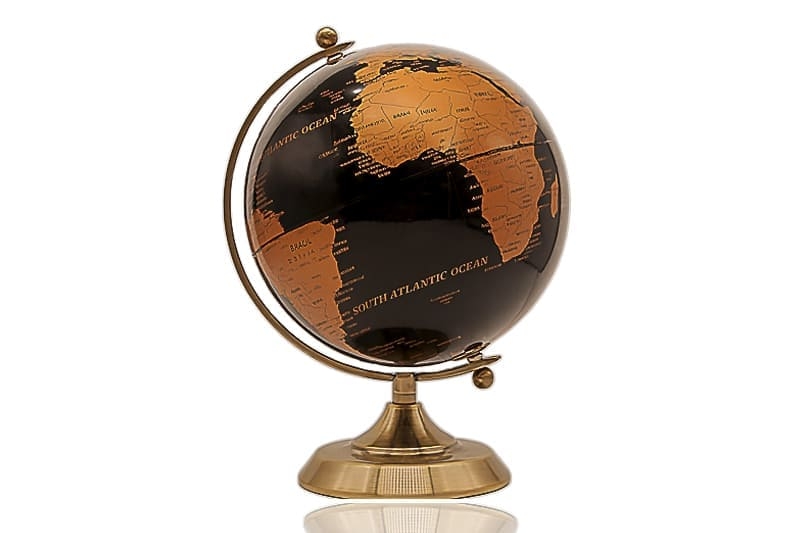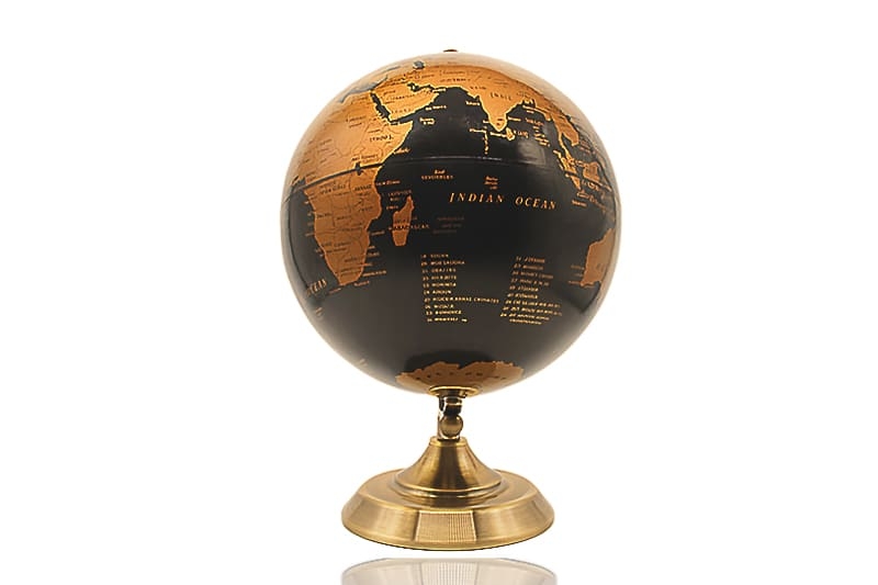 • 30 cm boyutunda, eskitme metal kaideli dekoratif dünya küresi.